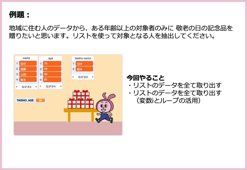 例題:地域に住む人の名前と年齢のデータを用意し、条件(例:60歳以上や80歳以上など)に合う住人を検索し、該当者を抽出してデータを作成する。