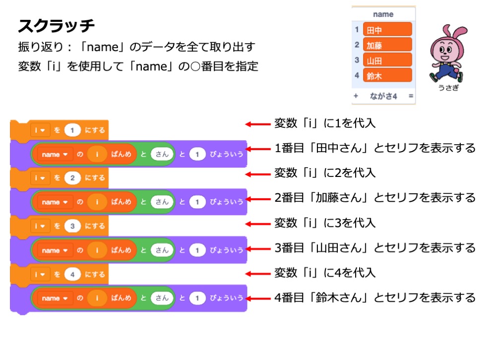 擬似言語では、「変数名 = (値)」で代入を行います。リストのデータを取り出す リスト名[添字] の添字部分に、Scratchと同様で i を用いて name[i] としています。