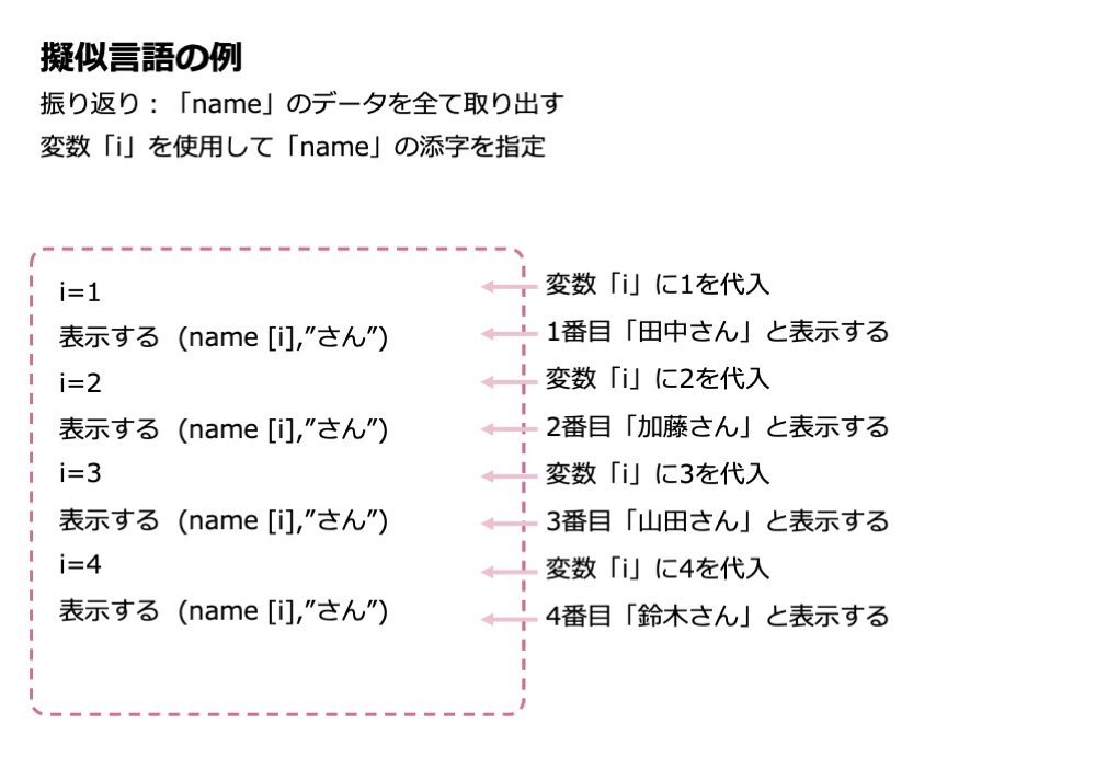 *添字の更新(インクリメント)部分は特定言語の構文ではなく「i を 1 から…」のような日本語混じりで表記されています。もし「I += 1」「I = i+1」「i++」といった表記があった場合にも説明文を読むことで理解できるはずです。