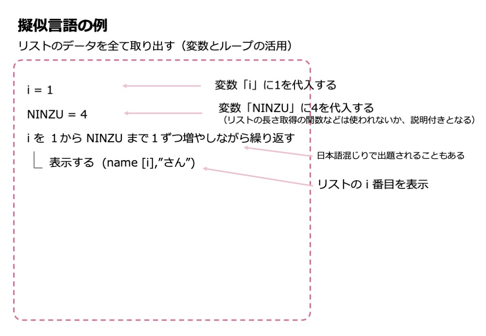*Scratchでは「リストのながさ」ブロックで値数を取得できますが、擬似言語では、値数を変数(NINZU)に代入する傾向があるため今回の例では揃えています。