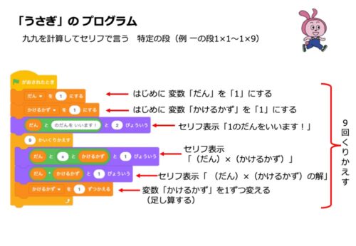 段を全てセリフでいうには、変数「かけるかず」を1ずつ増やしながら、9回繰り返します。例えば「だん」に「1」が入っているとき、計算式は「1×1」「1×2」…「1×9」と進んでいきます。