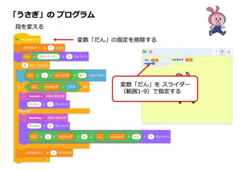 前回は一の段から九の段まで、変数と繰り返しを使って九九をセリフでいうプログラムを作りました。これをもとに任意の段を学べるクイズコンテンツに改造していきます。